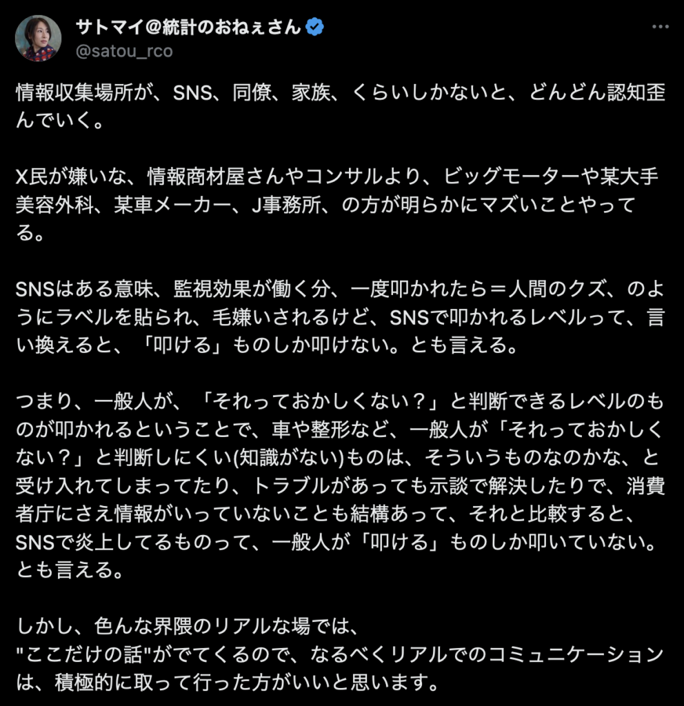 いやマジでそうなんだよ。しかもそこそこの収入でそこそこの年齢のヤツほど。最近。叩けるものだけを叩き、よくわからないものは「そういうものなのかな」と受け入れたりする。それ相当やばいんだよ。絶対に穏やかな気持ちで人生を終わることはない。断言する。