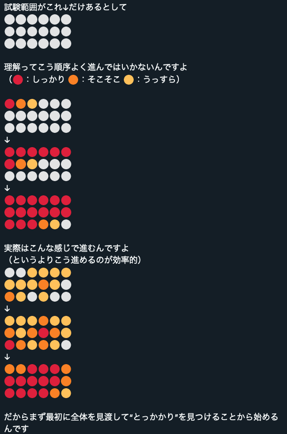 スキルを身につけるということ メンタル X Facebook はてブ LINE コピー 2024.01.03 これほんとにそうなんだよね。これは資格とかの試験だけじゃなくて仕事や趣味の勉強でもそうなんだよ。かたくなに上のイメージで進めると思ってるやつはたいてい途中でココロ折れてつぶれる。