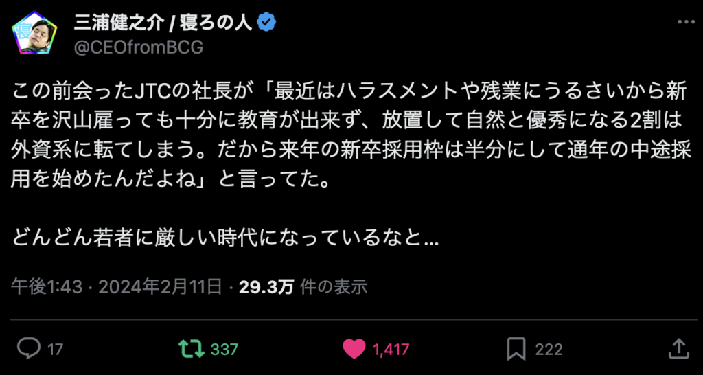 2年前までいた現場はホワイト気味な中堅SIerだったがこれはよくわかる。もはや大学新卒採用ってかなりきびしいのになぜまだやってるのだろう?(たとえ転職エージェント経由の中途採用より採用コストが安いとしても)教育&就職&転職界隈のしくみを根本から考えたほうがいいかもだが、もはやいったん崩壊するしかない気もしている。