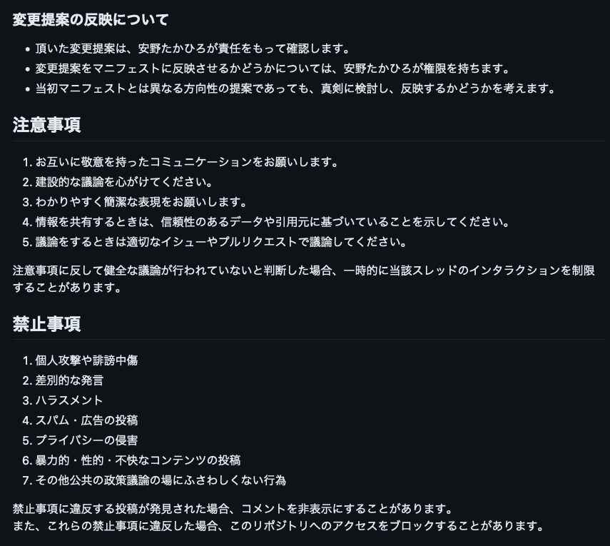 選挙中マニュフェストなどもGitHub(知らない人は知らないでもいいです。ITの仕事をしている人なら知っておくべきというか、もはや使っていなければダメだろです)で公開し、随時誰でもマニュフェストへのコメントや追加・変更リクエストができるようになっていた。これはなかなか斬新だった。ただそれが選挙において強さではないとは思うが。