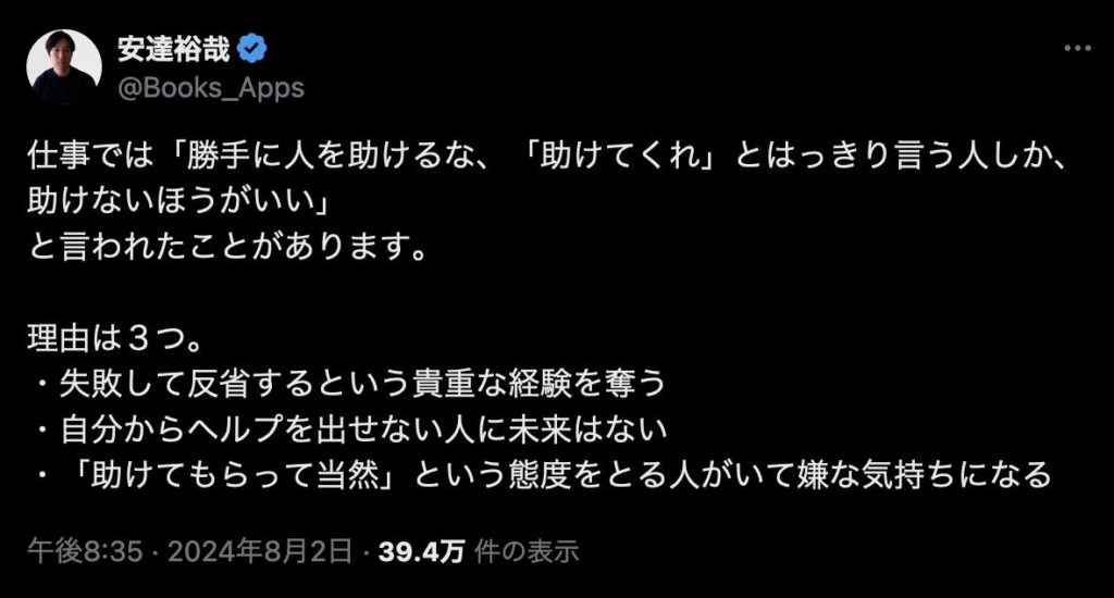 これわかる。これも一種のコミ力かと。ただしどういうことをやってどういう聞き方をしてくるかも大切。むずかしいがここは通らないといけない。自分も自分を助けるがそこを手伝ってもらう的な。ChatGPTもそのひとつ。人間の代わりになんかやってくれるのがでかいのではなく、人間の手伝いができるのがでかいのだ。