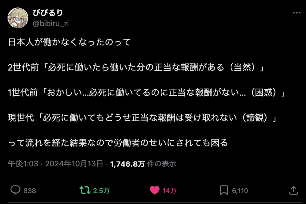 まさにこのとおりだと思う。だから頑張ってる人が報酬・待遇で報われてほしいと思うし、これは残念なのだがあまりおおっぴらに言いたくないのだが、報われない環境で頑張っちゃう人はある意味同罪だと思うのだ。言ってしまえばアホで頭が悪いということだ。あー言っちゃった。でもちょっとでもそういうこと考えてほしい。このままではなにも変わらないのだよ。ブラック企業をやめないひともブラックなのだよ。