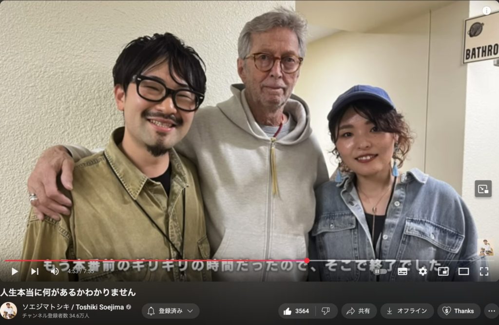 YouTubeのギターの先生(勝手に私がそう思ってる人たち)のひとりソエジマトシキさん。エリッククラプトンがインタビューの中で注目しているギタリストとして名前をあげて、その流れでふたりが面談することに。僕が先生にしているYouTubeの人たちはとてもまじめそうでおだやかそうな人が多くて、なかでもソエジマさんはもうベスト・オブ・ソフト! 夢のようでまったく覚えてないと話してますがほんとによかったと思います。真面目な努力はいつか報われるのですね(老害っぽい説教)
