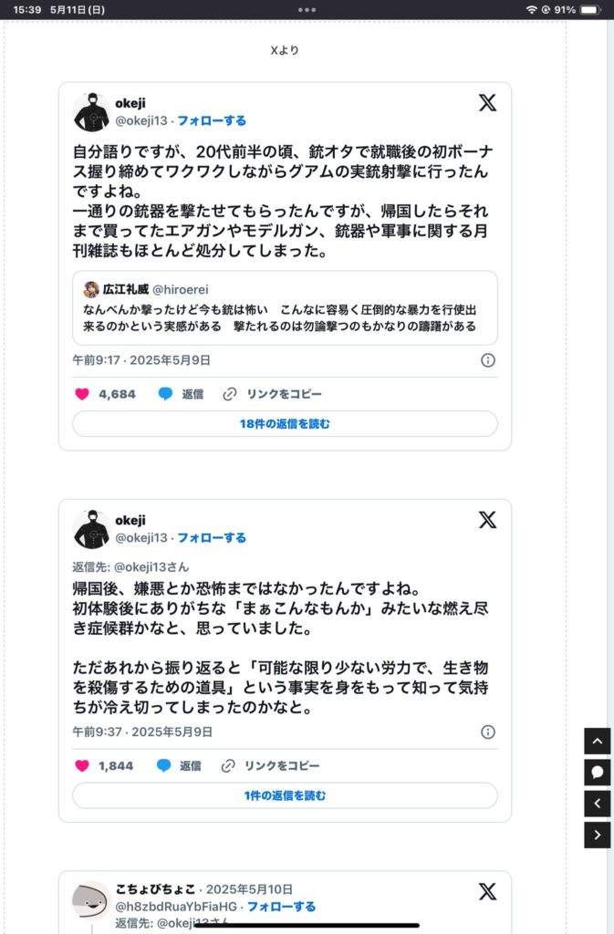 私は銃オタではないが小学校の時マンガの影響でかなり銃に詳しくモデルガンも持ってたりした。23歳くらいに社内旅行でグアムに行ってはじめて銃を撃ってみた。大きめのリボルバー系だったと思う。9割くらいほぼ的の中心近くに当たった。「オニーサンウマイネ」と射撃場の人に言ってもらったが1発目からもぞもぞとした恐怖感というか罪悪感が止まらなくなった。乾いたパンッッ!!という音。その瞬間間違いなく壁に食い込む銃弾。「あーたったこれでだけで人死ぬし殺せちゃうんだ」という感覚は今でもある。虚無感無力感に近かったりもする。バトルゲームで俺が弱いのはきっとこれだ。(いやゲームの腕は関係ないぞ