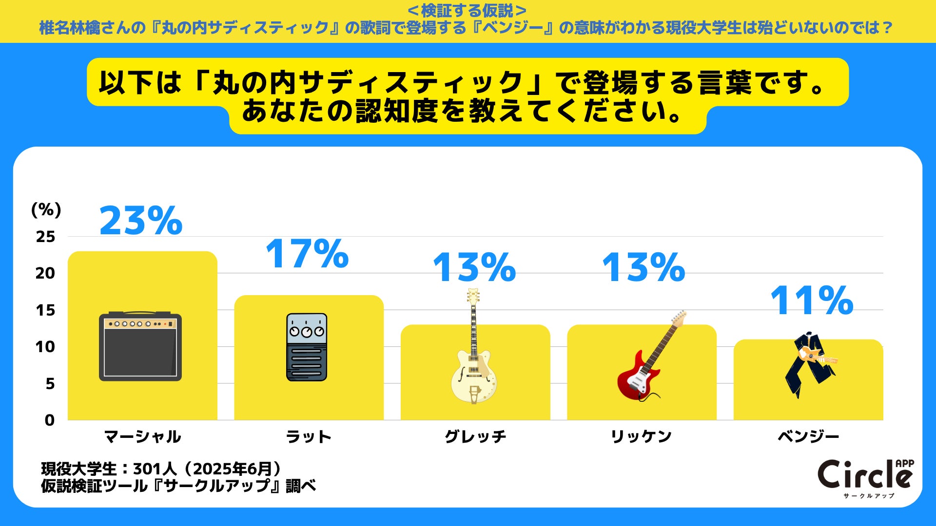 椎名林檎の「丸の内サディスティック」に登場する「ベンジー」の意味がわかる現役大学生は何%いるのか、調査結果を公開。
