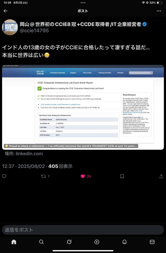 CCIEというネットワーク関連の最高難度資格があり、それをインドの13歳女子が取得したらしい。すげー。持ってるだけで年収1000超えは普通というかそれだけのスキルの証明。ちなみにCICSO社の資格ヒエラルキーでCCIEの次のCCNPという資格を私は持っている。←こっそり自慢してみた。だがCCIEとの差はでかすぎる。CCIEは筆記のほかに実技試験もあるからな。それが死ぬほどきついらしい。